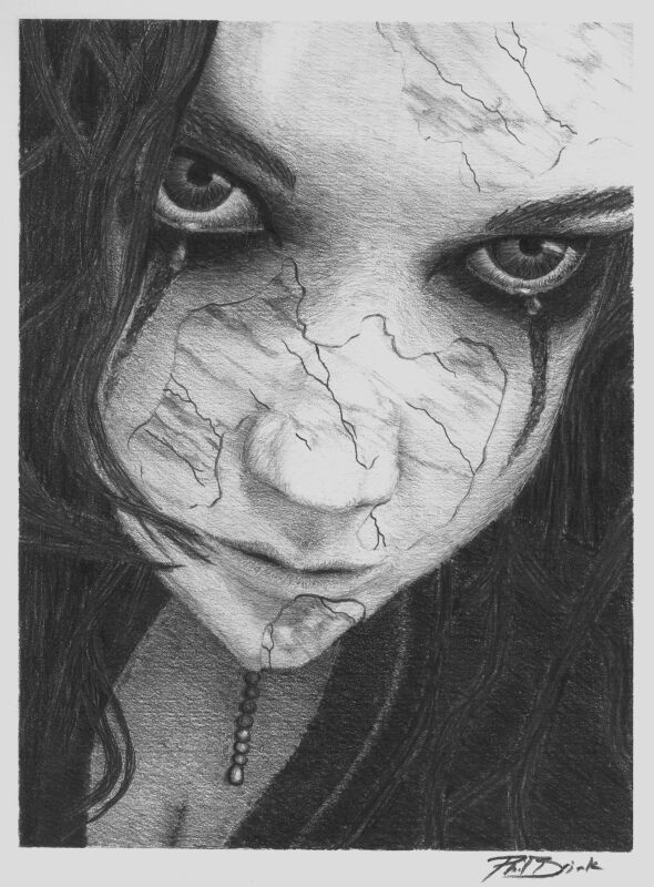 A past-friend asked me to draw her and encouraged me to capture her in the image. As she suffered from mental health illness and struggled to find her way through failures and successes, this is what I came up with. Our external image falls away through tears and pain only to expose who we are. It is our stone-like strength deep within that we find in the hardest of times. Sometimes, others cannot see past a strong facade to see what is really there. It is easy to be pushed away by unusual sub-cultures and 'strange' appearances. Seeing the true individual and who they are, takes caring about details other will miss. Follow the path on her cheeks and you will find their source. |